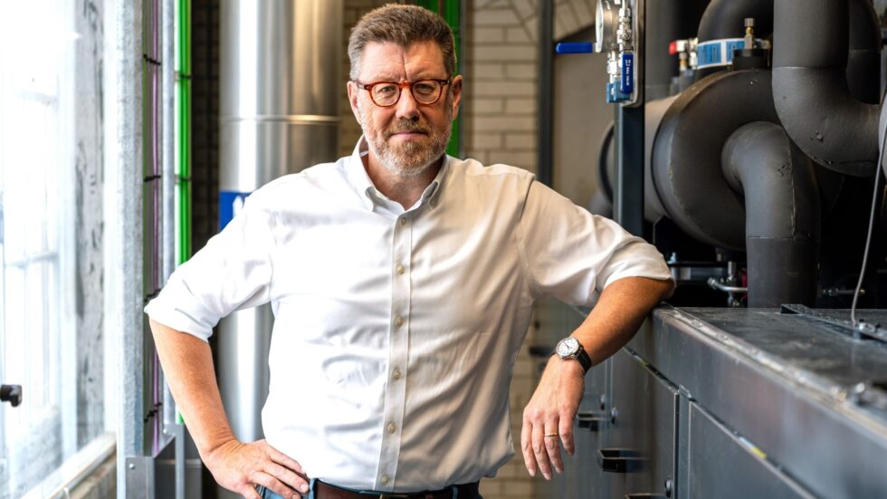 Bildet: Energidirektør Gorm Elikofer ved Hofors nyeste varmepumpe i Tietgensgade, som bruker overskuddsvarmen fra fjernkjøling og sender den ut til litt over 3000 leiligheter. Foto: Hofor.