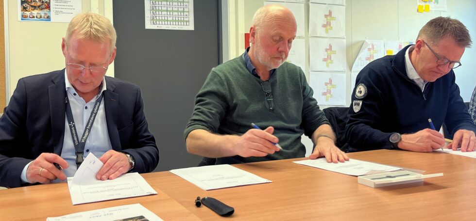 Kontraktsignering. Fra venstre: Karl Otto Jansen, prosjektdirektør Nye Aker, Dag Bøhler, programdirektør OUS og Rune Johansen, regionsdirektør GK
