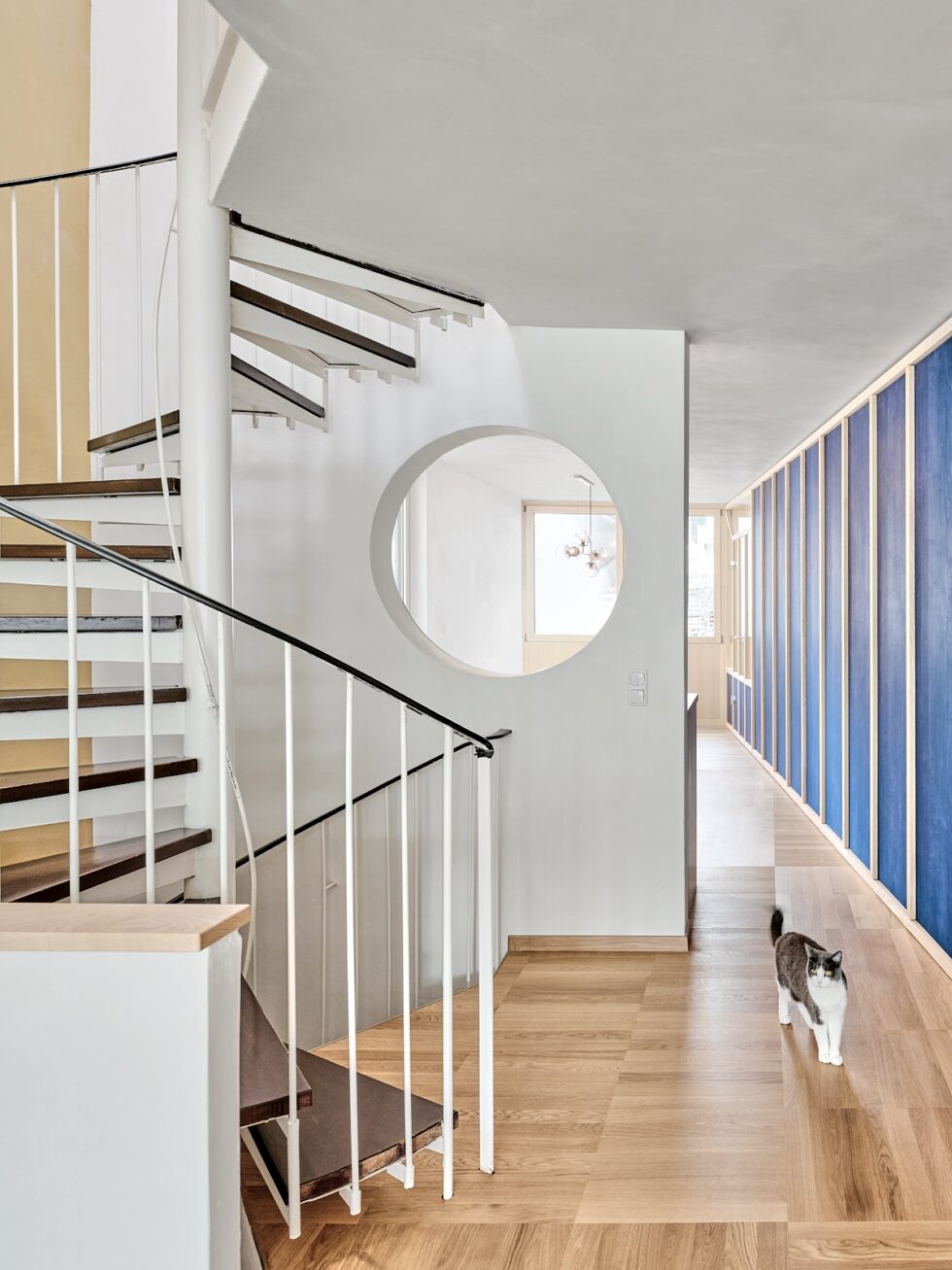 Alle skillevegger ble fjernet for å tilføre lys og en følelse av romslighet til det smale rommet, en oppfatning forsterket av integreringen av en trekantet vestibyle og asymmetrisk eikeparkettgulv som går gjennom hele rommet.