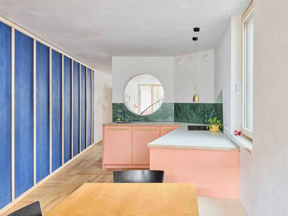 Fargepaletten er en typisk syttitallskombinasjon av dype grønnfarger, rosa, blåfarger og taktile leirpussvegger som lekent fremkaller tiåret i en lys, luftig og fargerik setting som er i samsvar med moderne livsstil.