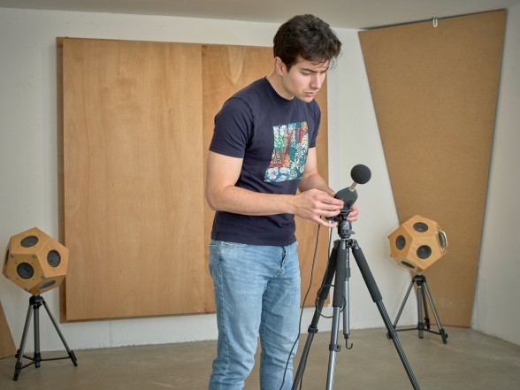 – I en ekte bygning er dette for eksempel soverommet eller leiligheten ved siden av. Hvis toalettspylingen nå aktiveres i installasjonsrommet, åpnes innløpsventilen, og vannet strømmer gjennom røret i veggen. Denne støyen er akkurat den vi måler, sier Pietro Allegri.