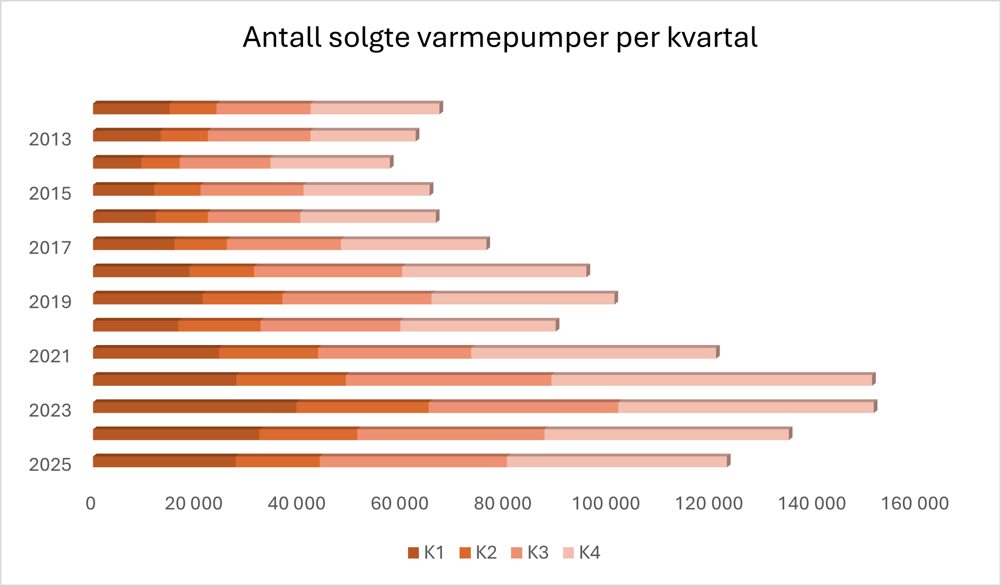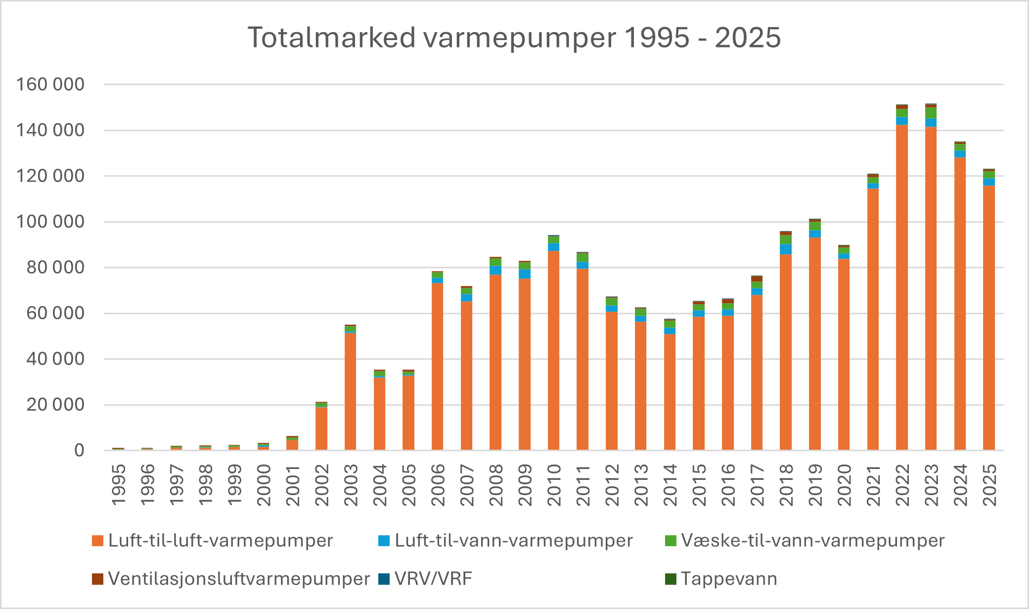 Totalmarkedet for varmepumper falt med 9 prosent i 2025 sammenlignet med 2024. Det ble totalt solgt 123 012 varmepumper i 2025, mot 135 023 i 2024 og 151 506 i 2023.