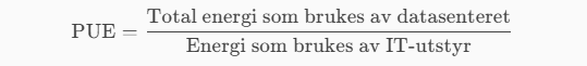 - PUE = 1,5 → For hver 1 kWh til IT-utstyr, brukes 0,5 kWh til støttefunksjoner.